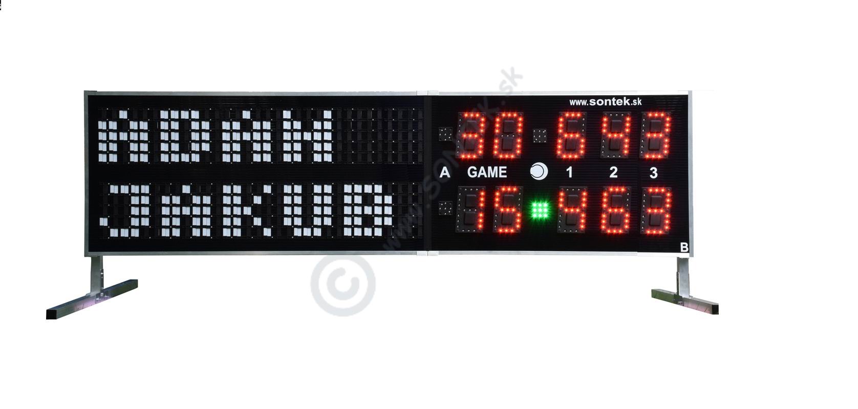 Svetelná športová tabuľa Tenis zobrazuje stavy 0, 15, 30, 40 číslicami veľkosti 17cm s vysokou svietivosťou. Obsahuje diaľkové ovládanie, napájací zdroj 12V DC/4A. Súčasťou produktu je aj hliníkový stojan. Mená hráčov sa nastavujú manuálne (táto časť tabule nie je elektronická).